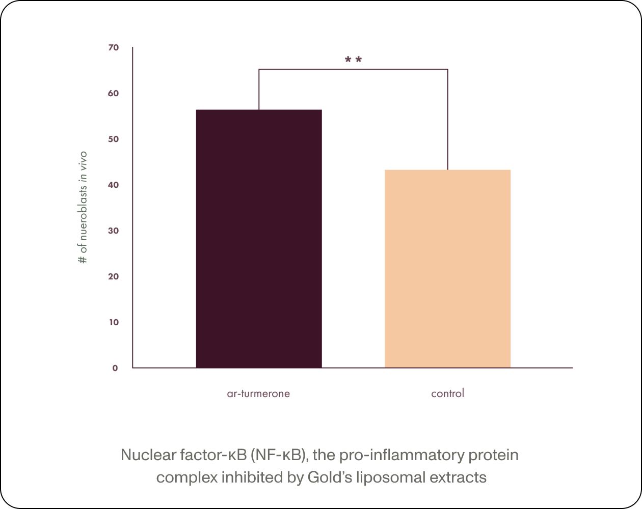The 600+% increase in bioactive compounds delivered by Gold's proprietary liposomal formulation produces a significantly greater inflammation-balancing effect in the body (vs conventional formulas). Clinical data has consistently shown significant decreases in benchmark inflammatory markers Hs-CRP (high-sensitivity C-reactive protein) and ESR (erythrocyte sedimentation rate).